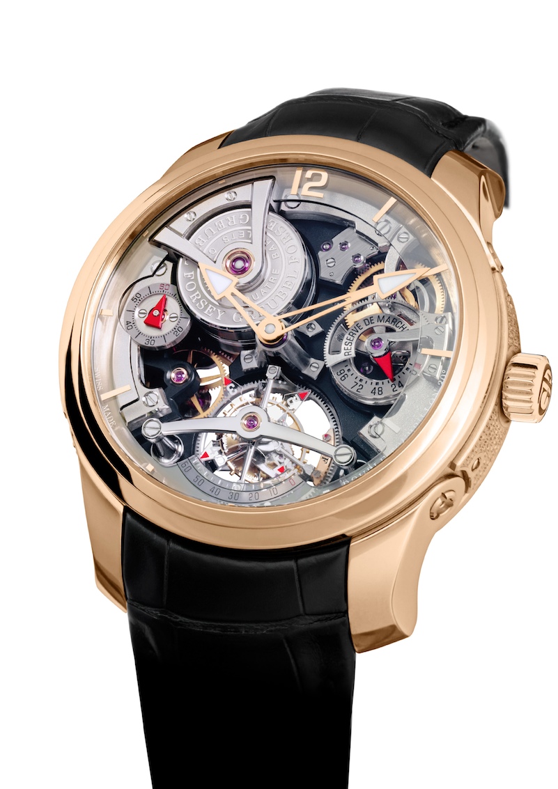 As well as red gold, this watch is available in platinum, white gold & black titanium. The strap is hand-sewn black, brown, dark blue, grey or burgundy alligator leather with gold (platinum or black titanium) folding clasp, engraved with the Greubel Forsey logo. Price – $556,000 (Available to purchase at J Farren Price: http://www.jfarrenprice.com.au/)