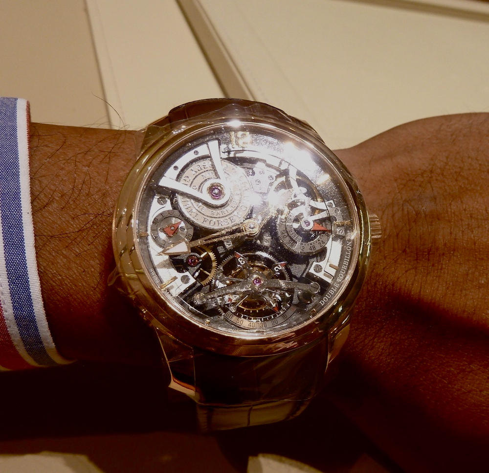 My first impression is that there is an incredible amount of detail to digest. This seems to be a pivotal theme of Greubel Forsey watches & is integral to their bold designs. The DTT is basically a beautiful watch & despite the complexity of the layout is pretty legible to read. The dial offers an amazing three-dimensional view of the mechanical movement. I love the skeletonized face comprising multiple layers creating the appearance of depth. The Double Tourbillon occupies center stage in its entire splendor showcasing the immense talents of the designers. Central hands operate the hours/minutes with discs displaying seconds & power reserve indicator.