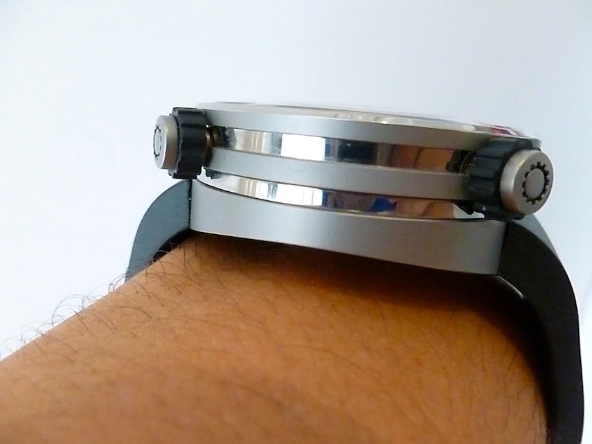At 48mm x 18mm it’s a pretty chunky timepiece & wouldn’t suit people with conservative tastes. I felt it was very comfortable & lightweight to wear. This is probably down to perfectly balanced wrist hugging design & titanium case. On that basis I feel it would be practical to wear the watch for most occasions. The QV48-W124N096 is from the classic range & has an anthracite dial with natural polished case. The four black dials & bold white numerals work in perfect juxtaposition. In my opinion this combination is very effective because it gives the timepiece an understated charm. Other varieties available are: Limited edition, Luxury, CCM (carbon ceramic) & the splendid “only one” collection (made from cars, bikes, helicopters & airplanes)