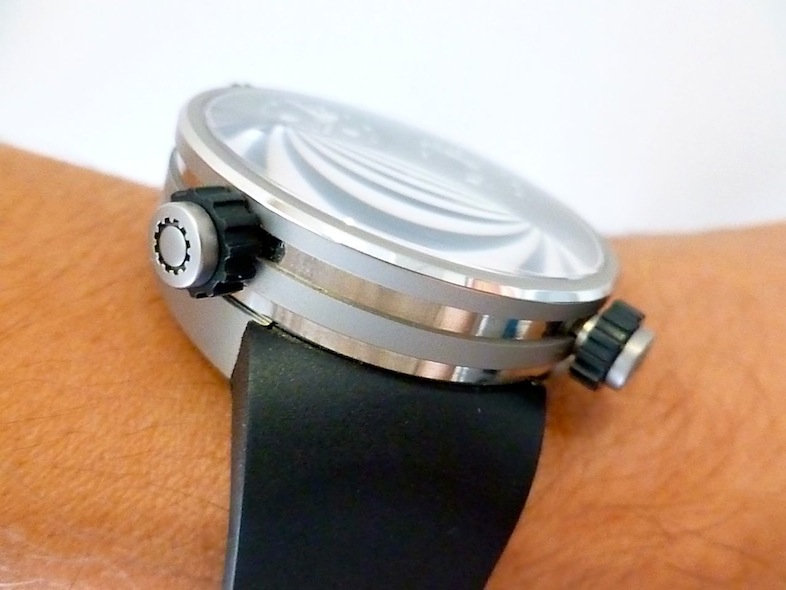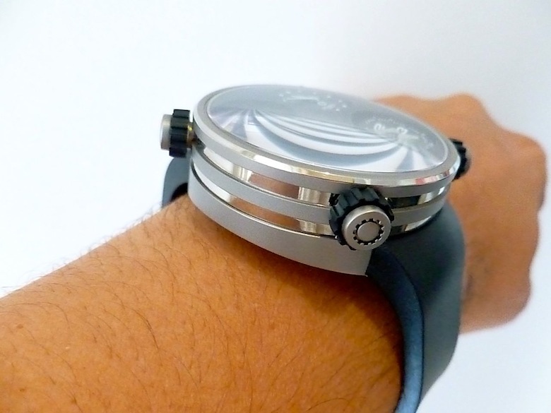 In 2009 Italian jeweler Cielo Venezi 1270 took ownership of the company. This marked a new horizon for Meccaniche Veloci & a shift of production from Italy to Switzerland. Subsequently the Quattro Valvole has been re-designed giving the watch a whole new dynamic. Personally I was reticent about reviewing the QV48-W124N096, as I love the aggressive styling of the pre-facelift model. The re-styled version has softer looks with one Sapphire Crystal glass instead of four. Also the four dials have different facades & the crowns have rubberised protectors. Fortunately the company hasn’t modified the structure of the case. All these modifications don’t detract from the brand identity & the watches’ very distinctive looks. Realistically I feel the new aesthetics will appeal to a broader demographic. Although I still share an affinity for its predecessor.