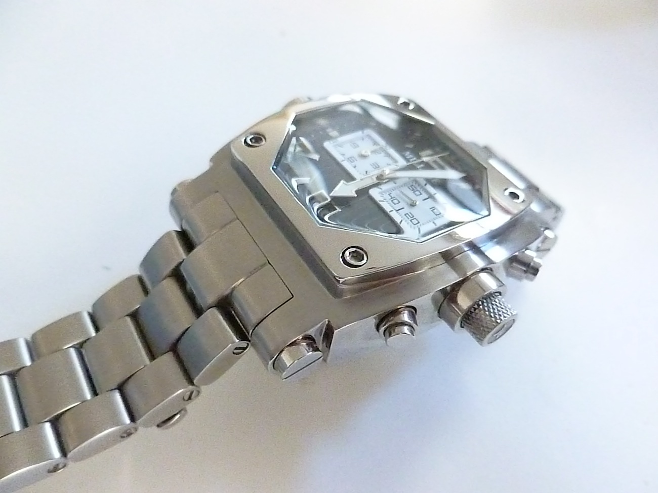 Fundamentally the watches key strengths lie in its classically sophisticated design. I love the octagonal black dial with contrasting white sub dials & twin date. This exquisite styling clearly draws inspiration from the glorious ‘Art Deco’ period. The attention to detail is exceptional with every element of the design working in perfect harmony. Also the finishing is superlative. I was especially impressed by the satin-brushed steel case with monogrammed pushers & bracelet clasp. The company states that only the finest Japanese steel was used in the production of this marvel.