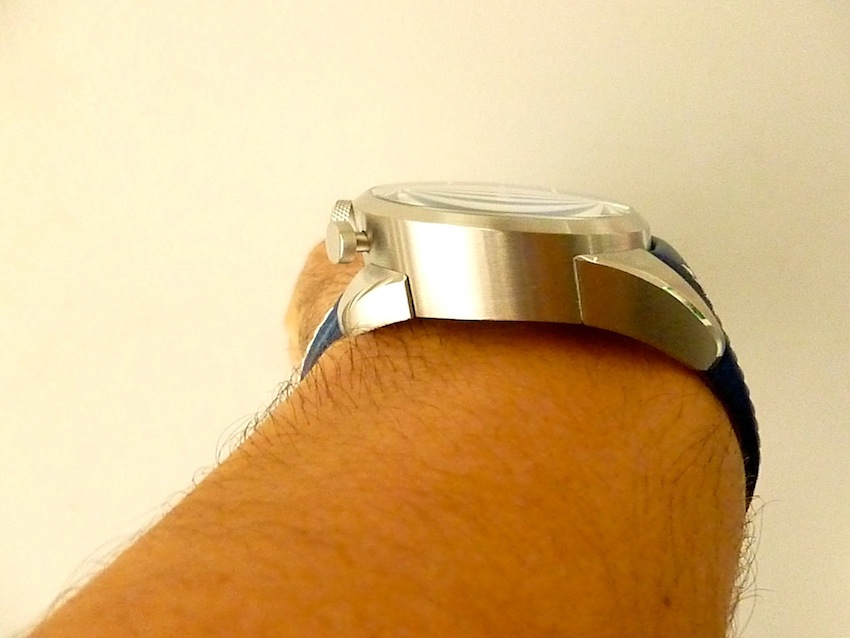 My initial impression of the 1968 is how stylish the actual timepiece looks. Realistically the watch looks and feels a lot more expensive than its $625 price tag. I also found it very comfortable to wear and definitely feel it would be suitable for any occasion. Primarily this is down to the cleverly sculpted 316L stainless steel case with asymmetric lugs and top mounted crown. Even though the watch was fairly lightweight on the wrist I would like to see the production of a Titanium model. With a diameter of 44mm (excluding crown) I can envisage these proportions would certainly appeal to a broad spectrum of buyers.