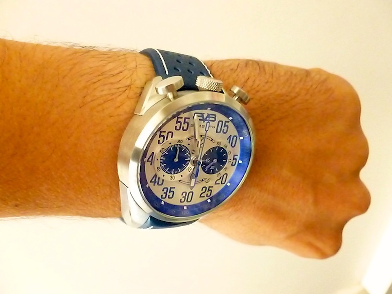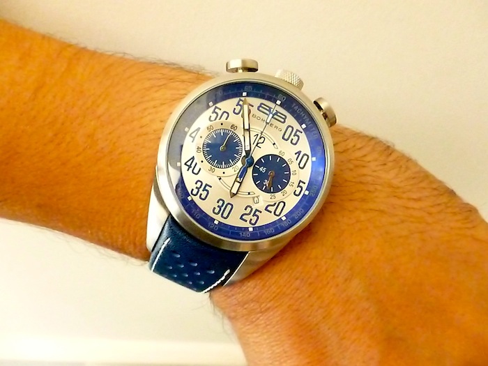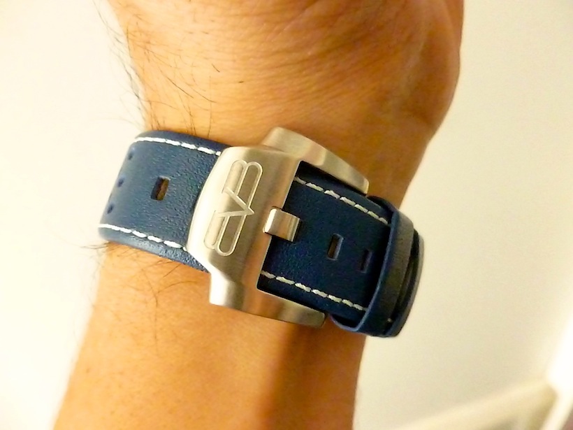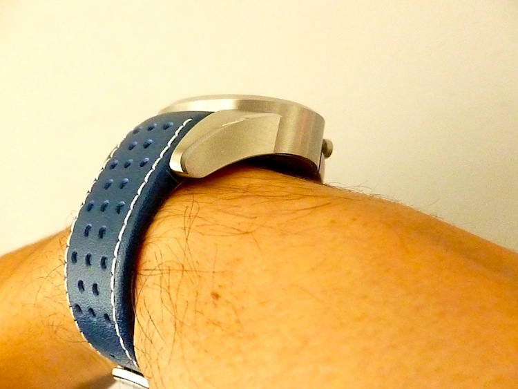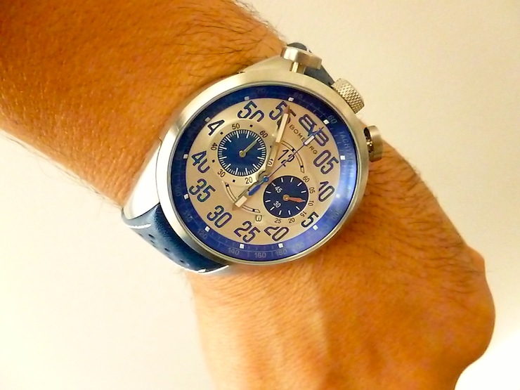 Underneath the robust exterior the watch is equipped with a decent enough Japanese quartz Miyota OS11 movement. In an ideal world I would love to see a Swiss automatic version of this amazing timepiece but realise that would significantly bump up the price. Functionally the 1968 features hours, minutes, seconds, date, chronograph and Tachymeter. The watch is also water resistant to a depth of 10ATM (100m) and is supplied with a trendy blue leather strap.