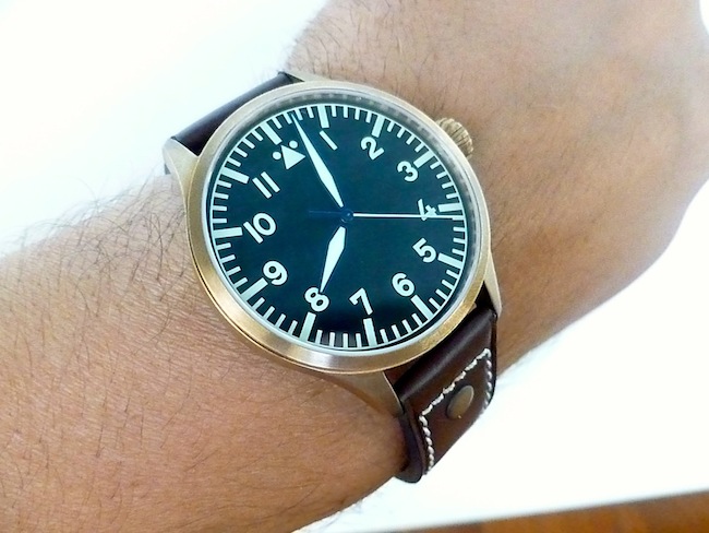 The Pilot 42 Bronze Automatic has a brown leather strap with bronze rivets and buckle. With a price tag of only €610 (approximately $819) this watch is a great deal.
