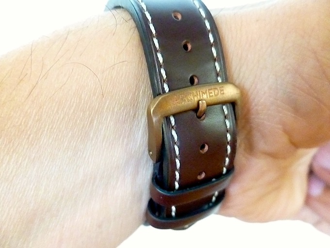 Aesthetically the façade of the Pilot 42 Bronze Automatic is minimalistic. What initially attracted me to test this watch was the choice of the case material used in manufacture. Archimedes has used a bronze alloy called CuSn8, consisting of 92% copper and 8% tin. This gives the timepiece a unique vintage appearance which perfectly contrasts with the subtle black dial. Other pertinent features include the bold white luminous numerals/indexes and solid bronze crown. Overall the composition is refined and understated.