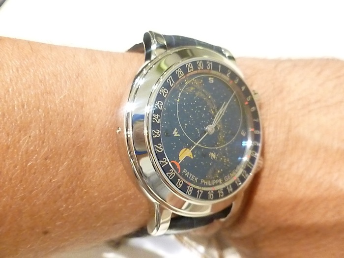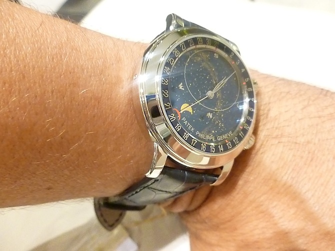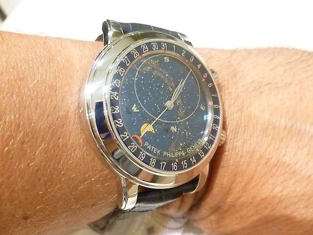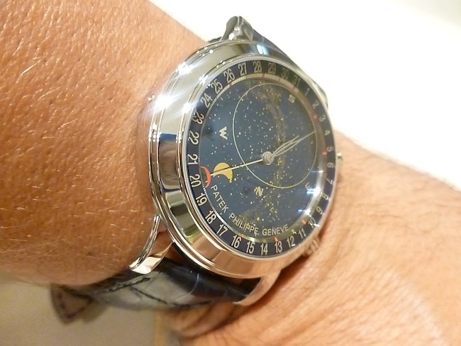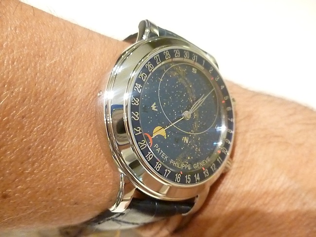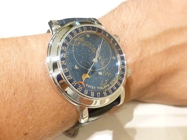 In June this year (2013) I published an article entitled ‘If Money Was No Object’. As the title suggests the editorial showcased five aspirational watches that might tempt a fortunate lottery winner. The sensational Sky Moon Tourbillon was one of my choices for its sheer elegance. This superb creation is one of the company’s most intricate designs and consists of 12 complications including a minute repeater, tourbillon and perpetual calendar. The dial also displays champlevé and cloisonné techniques of enameling. Incidentally this is the first and only model I have featured from Patek Philippe so far. On a business trip to Sydney I got the opportunity to try on another one of their magnificent timepieces. The model in question was from their Grand Complication range and is called the Platinum Celestial 6102P.