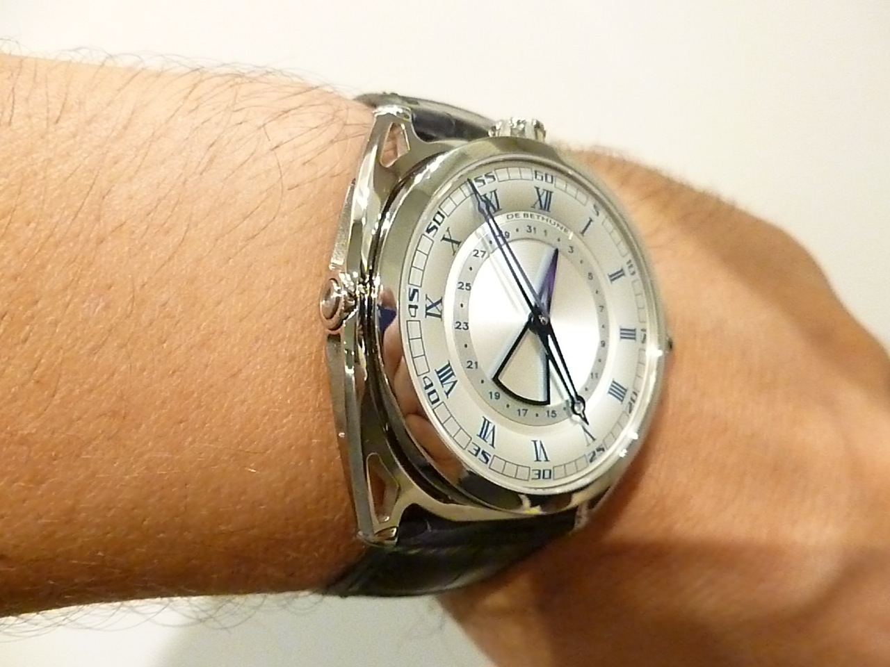 Aesthetically the DB27 Titan Hawk has a more classical façade than the majority of De-Bethune’s other models. Ultimately this should appeal to an audience with more traditional tastes. The microlight silver toned dial is understated and has a high quality appearance. A raised chapter ring displays Roman numeral hours and Arabic number minutes. I love the open worked blue steel hour/minutes hands and central date marker. Overall I feel the composition has been thoughtfully considered and executed to perfection.