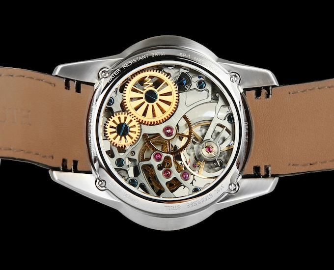 Beneath the futuristic façade Azimuth have equipped the timepiece with a Caliber AZM 768. This manual winding movement comprises 17-jewels and oscillates at a frequency of 18,000 vibrations per hour. The mechanism has been skillfully engraved with Côtes de Genève decoration and is visible through the sapphire crystal case back. Functionally the SP-1 Spaceship Predator features mystery jumping hours, minutes and is water resistant to 30 metres.