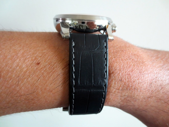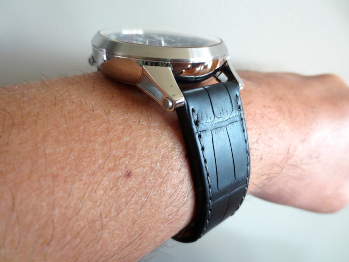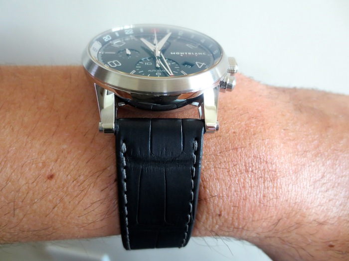 The Timewalker Chronovoyager UTC has a black alligator strap with matching steel pin buckle. Priced at: $ 6,415