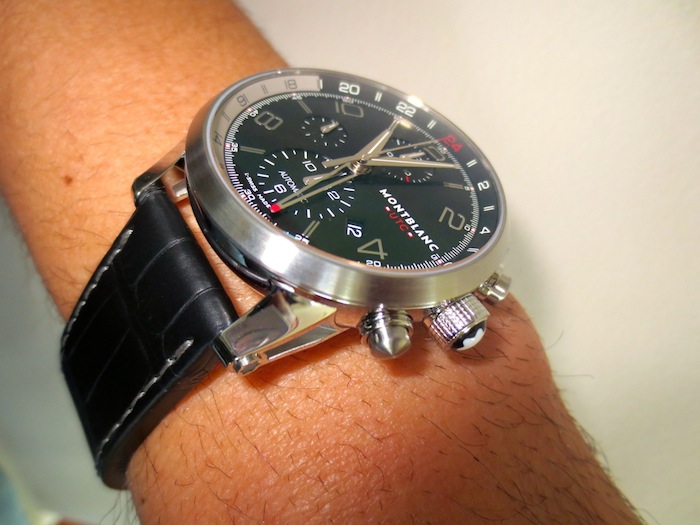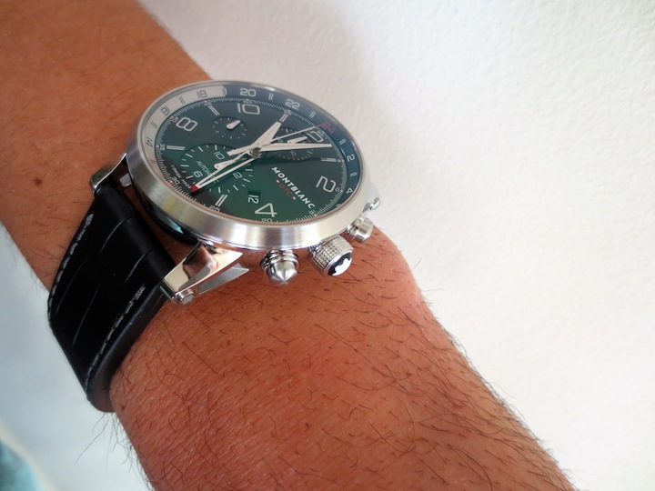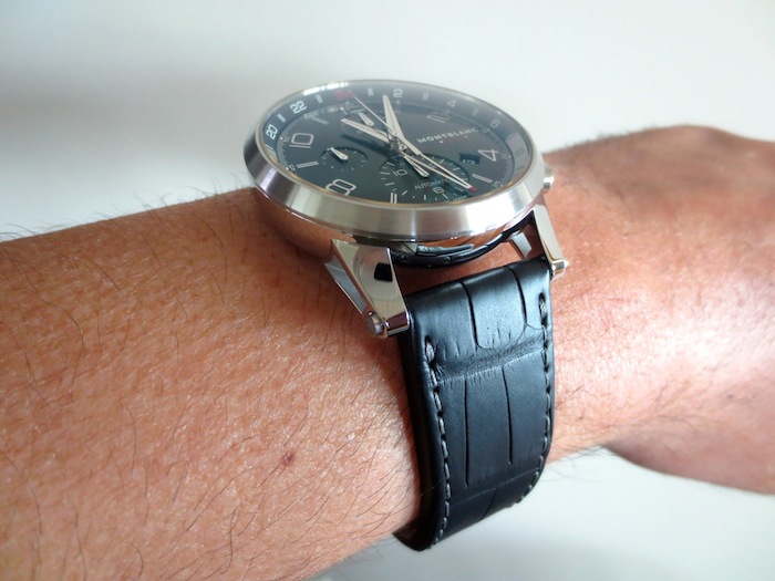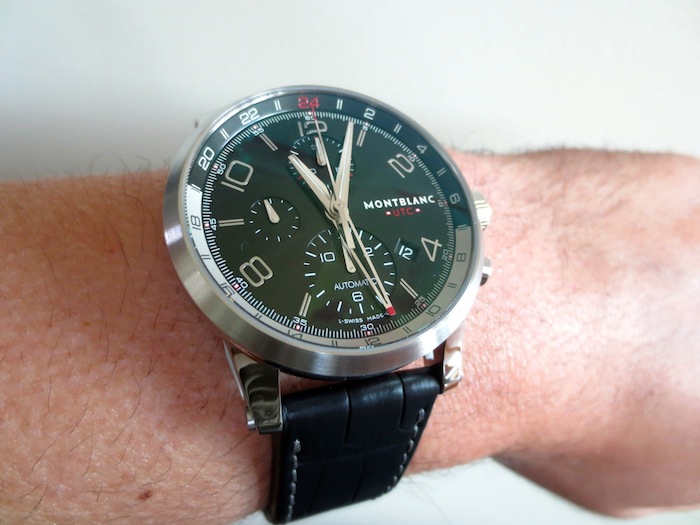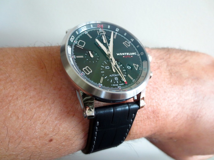 Visually the Timewalker Chronovoyager UTC has a really distinctive and striking appearance. What makes this timepiece so amazing is the well-considered sporty silhouette. Details like the three chronograph sub counters are very pleasing and highly practical. I love the open worked GMT hand and the 24-hour day/night scale presented on the inner chapter ring. Even though this isn’t a particularly large watch I feel Montblanc have used the space very efficiently. Other attractive features include a discreet brushed steel bezel and ornate crown. Overall the composition has been expertly handled and the finishing is first class.