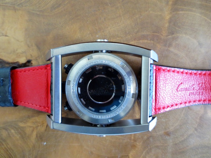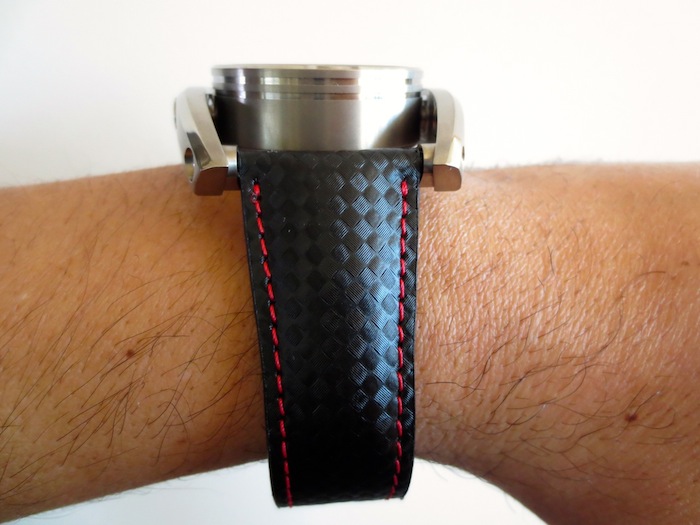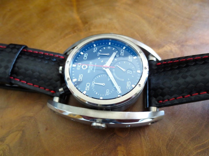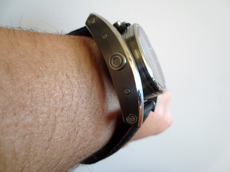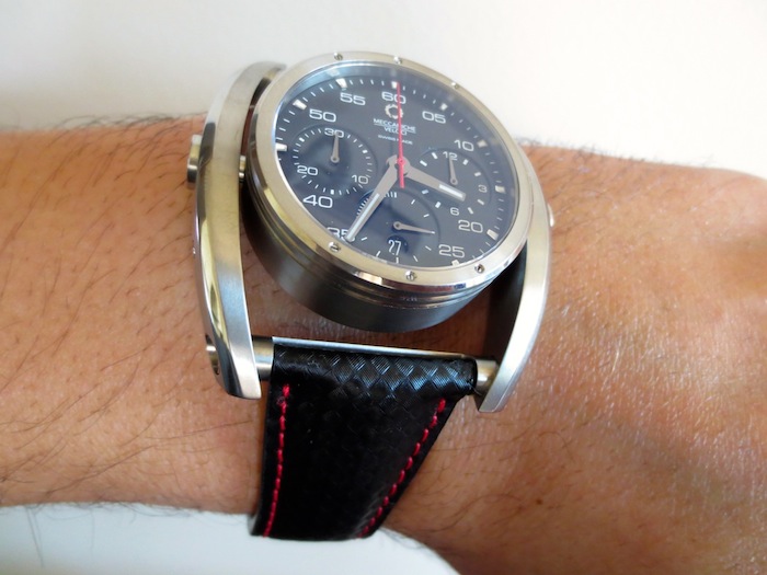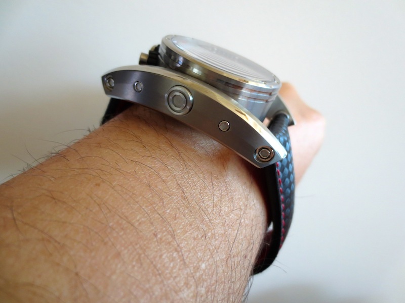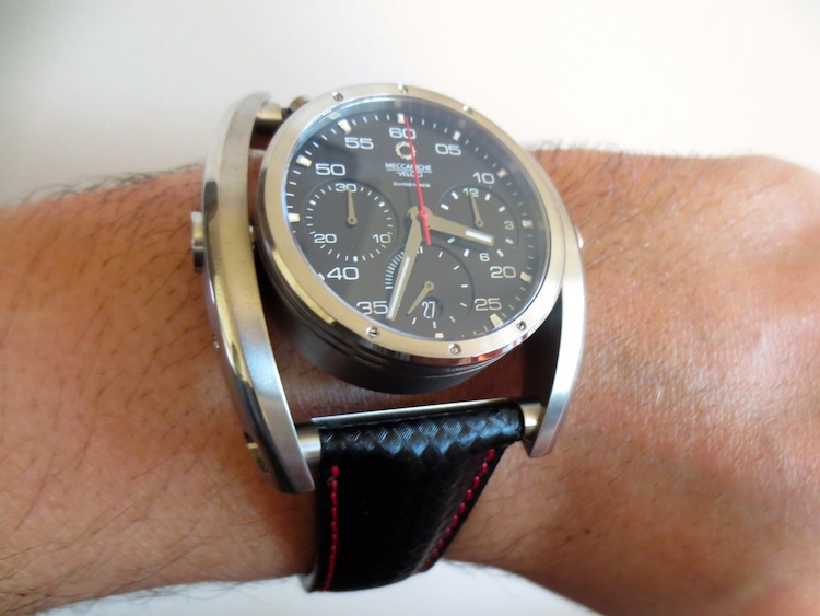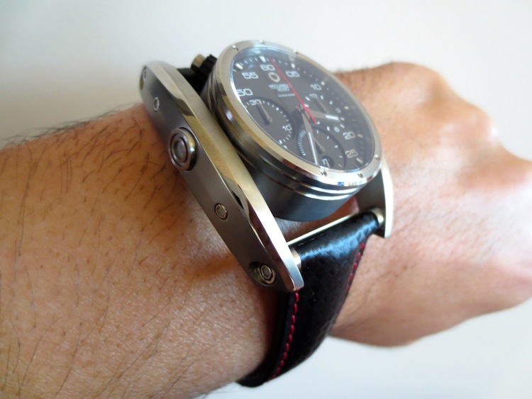 My first impression of the watch when I received it was mainly positive. The 38mm diameter timepiece has a distinctive swinging frame, which makes it appear much larger. The dial is pretty striking and has three sporty chronograph sub counters. Another interesting characteristic is the top mounted oversized pushers and lugs. Generally I found Chrono Driver sat comfortably on my wrist and I didn’t experience any friction from the lugs. It also felt very lightweight and could definitely be worn for most occasions. Primarily this is down to the ergonomic design and choice of high performance natural titanium used in production. It is also pertinent to mention Meccaniche Veloci have another exciting model constructed from carbon fiber. Overall I was impressed with the attention to detail although I do personally prefer the aesthetic of the Quattro Valvole series of watches.