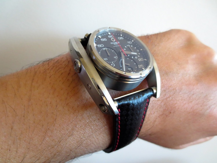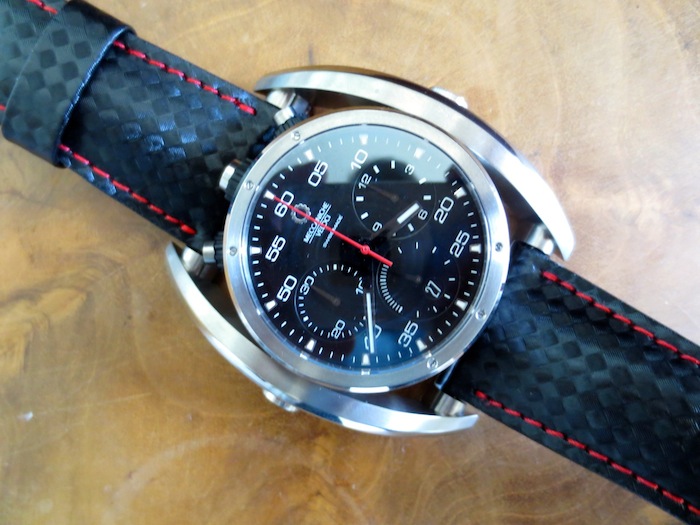 The Chrono Driver has a high quality leather strap with carbon fiber pattern and a matching natural titanium buckle. Priced at: $5,100 AUD (approximately $4,726).