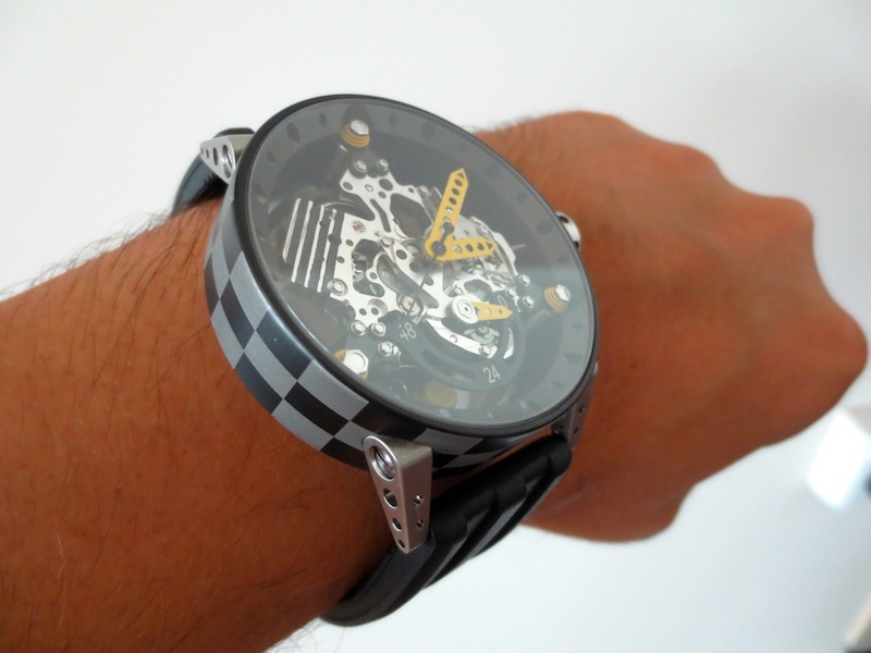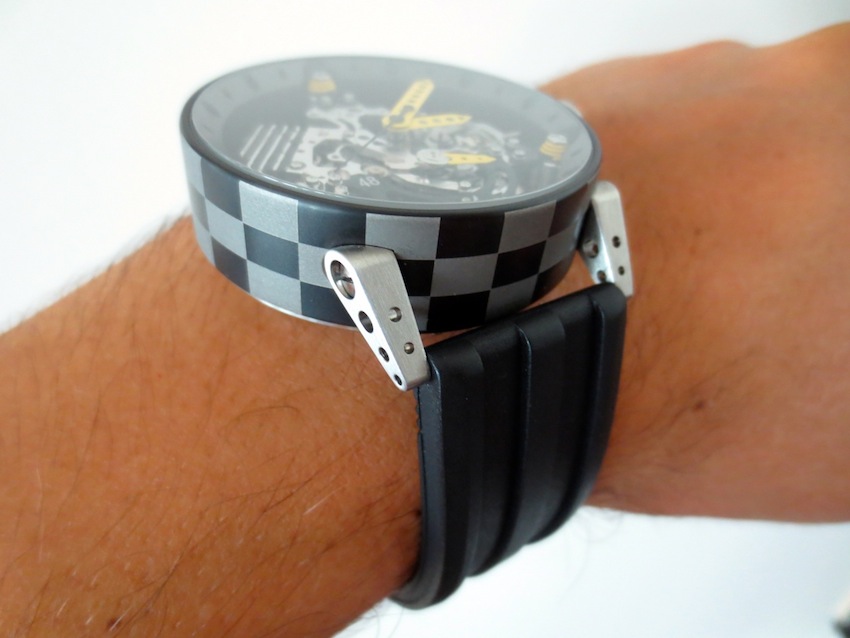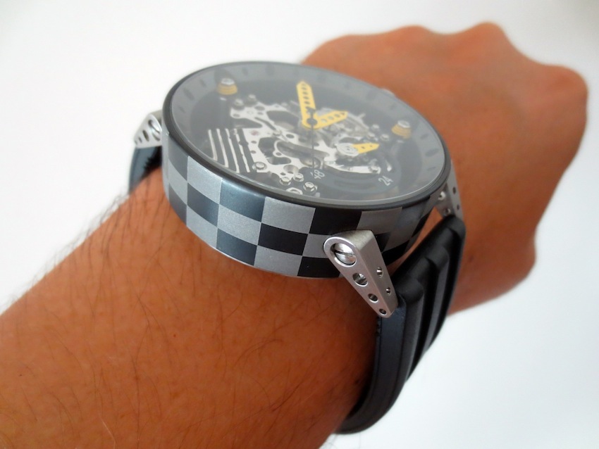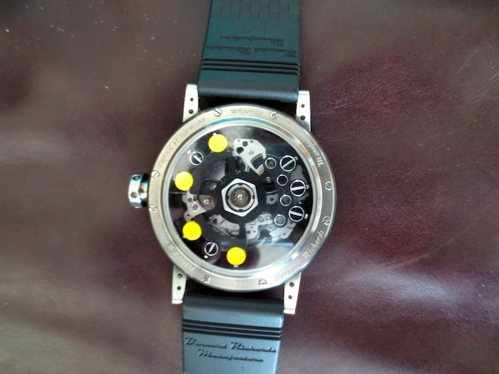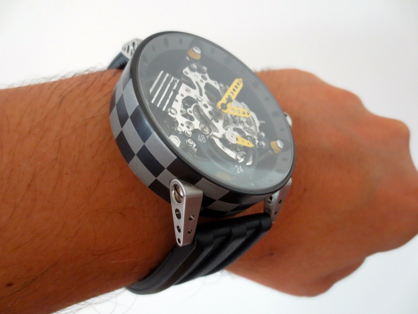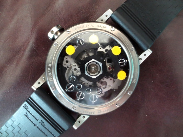 Visually the R50 TN has an incredibly high quality three-dimensional appearance. What makes this watch so extraordinary is the mesmerizing open worked dial. This wonderful characteristic was devised by Bernard Richards and is inspired by the engine of a motorbike. The movement is delicately mounted on three carbon fiber triangles. It not only looks spectacular but also acts as an efficient shock absorber. Other striking features include the vibrant lightweight yellow hands/power reserve indication, distinctive lugs and trademark checkerboard pattern on the side of the case. Overall the composition is brilliant and the attention to detail is first rate.