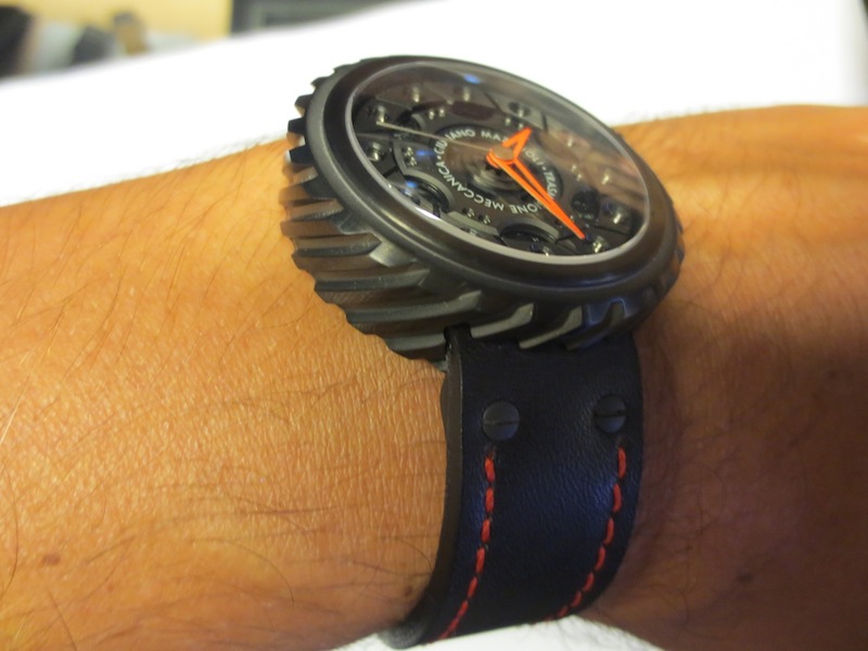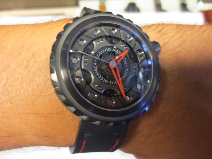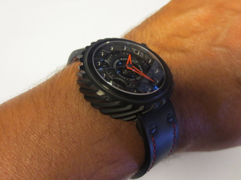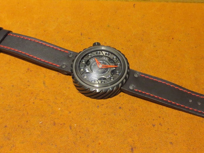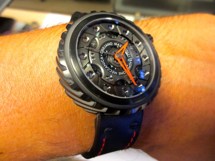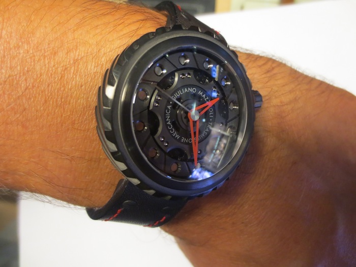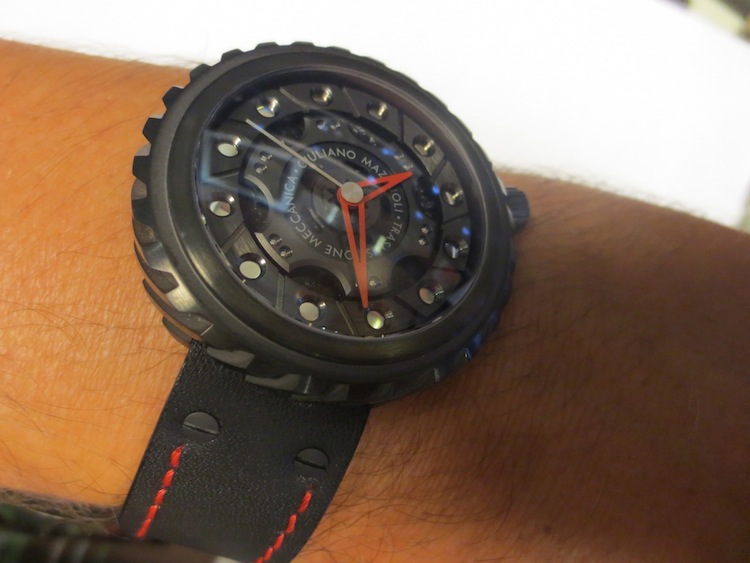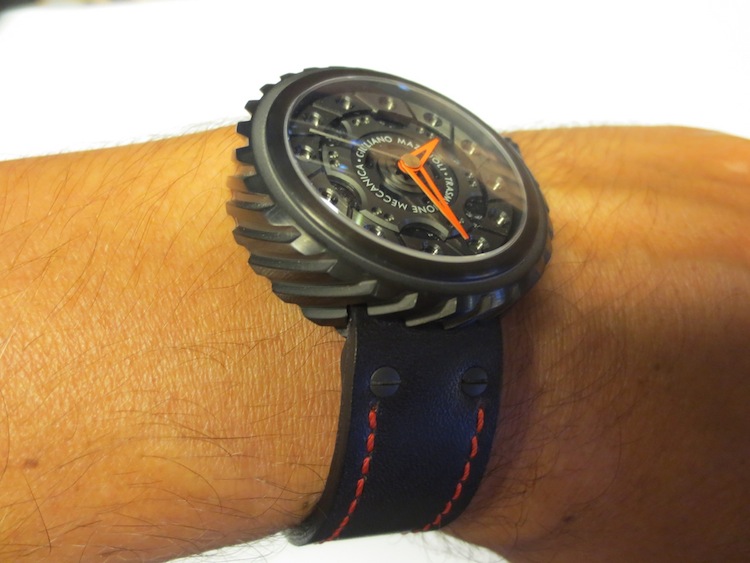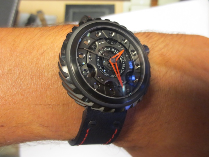 Like most of Giuliano Mazouli’s creations, the façade of the Transmissione Meccanica is inspired by an element from a car. In this particular instance the partially skeletonised dial is based on an automobile clutch and the distinctive case on the gears. These characteristics make this design really unique and in my opinion very accomplished. Other features include stylish red open worked hour/minute hands, anti-reflective sapphire crystal lens and an oversized crown (positioned at 2 o’clock). Overall the multi-layered composition is effective and the finishing first rate. Certainly I feel for a watch of this calibre, (designed in Italy and manufactured in Switzerland) you are getting a lot of bang for your buck.
