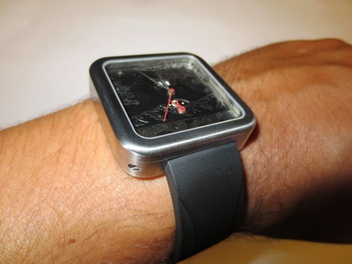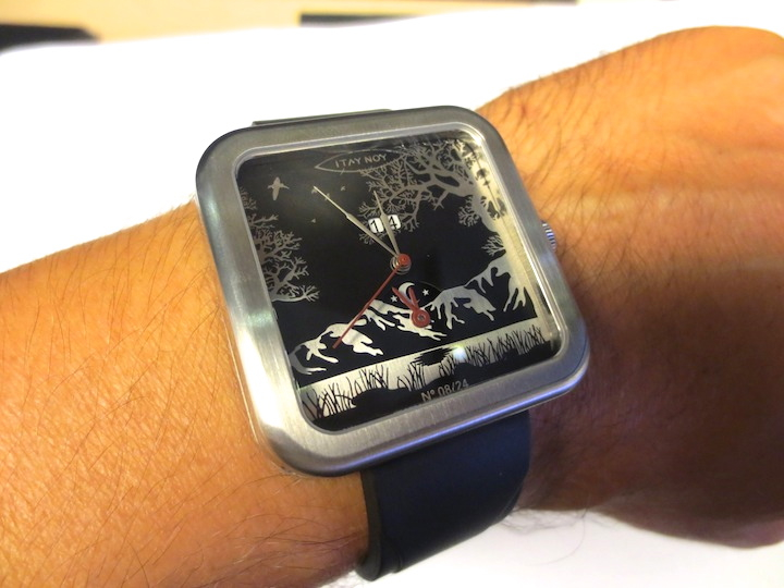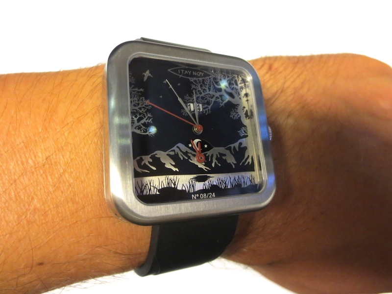 Last year I wrote an in depth article about Itay Noy’s wonderful Hyper Scape collection for Luxurious Magazine. Within the series there are four exciting models to choose from. Whilst I was visiting Singapore, Red Army Watches (http://redarmywatches.com) kindly gave me the opportunity to try on the fabulous Landscape B. Prior to this I had only ever seen pictures of this watch, which certainly don’t do it justice. Dimensionally the timepiece measures 42.4 mm X 42.4 mm x 11.6 mm but appears much larger due to the square case. Generally I found the watch sat comfortably on my wrist and felt fairly lightweight. However for a timepiece costing nearly $7,000 I would have expected the use of titanium rather than 316L Stainless steel.