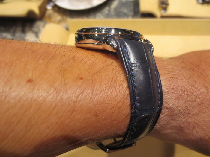 The V-8R has a hand sewn crocodile strap with matching 18-karat white gold buckle.