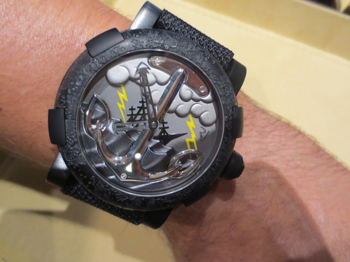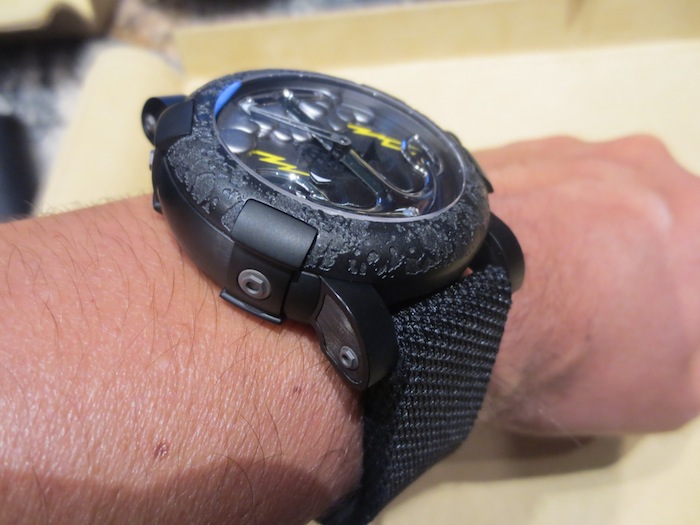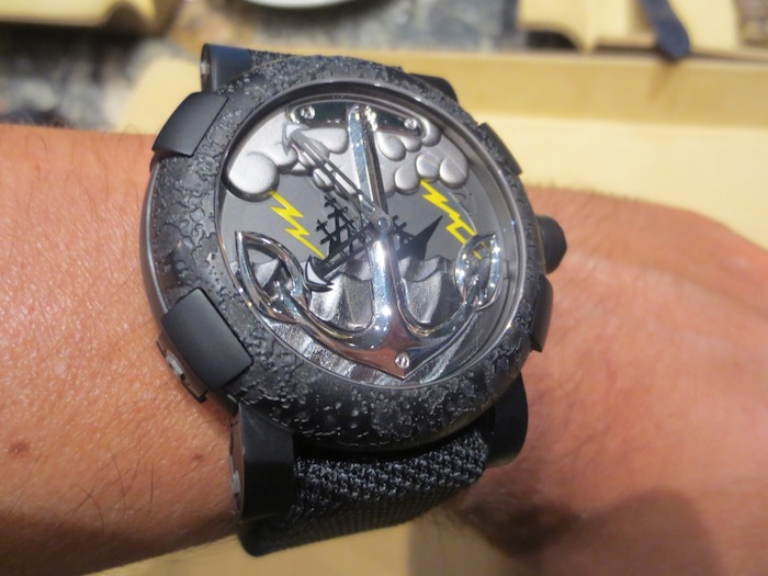 Visually the Tattoo Capsule delivers on its promise and has a really striking appearance. It is not the first time that a watchmaker has explored the Tattoo theme. Just over a year ago I featured Linde Werdelin’s sensational Oktopus Moon Tattoo with a hand engraved gold case. The concept of the Tattoo Capsule is slightly different and design mostly revolves around the dial. I love the distinctive façade depicting a sailboat anchor with bolts of lightning. Accomplished artist Mo Coppoletta has created this sublime three-dimensional embossed style illustration. Other successful features include open-worked hour/minute hands, textured black bezel, oversized crown and sapphire crystal lens.