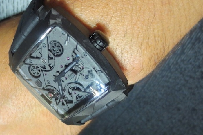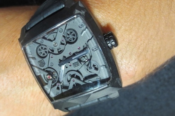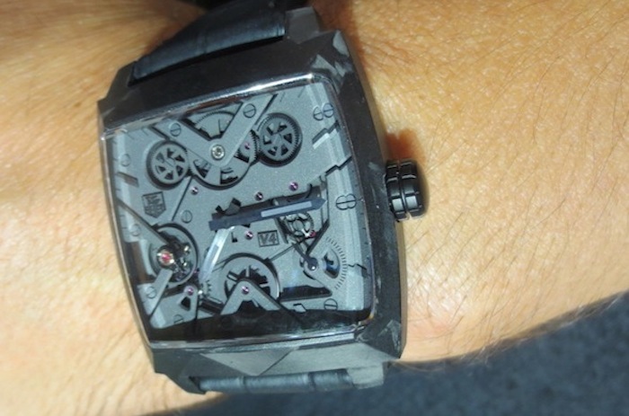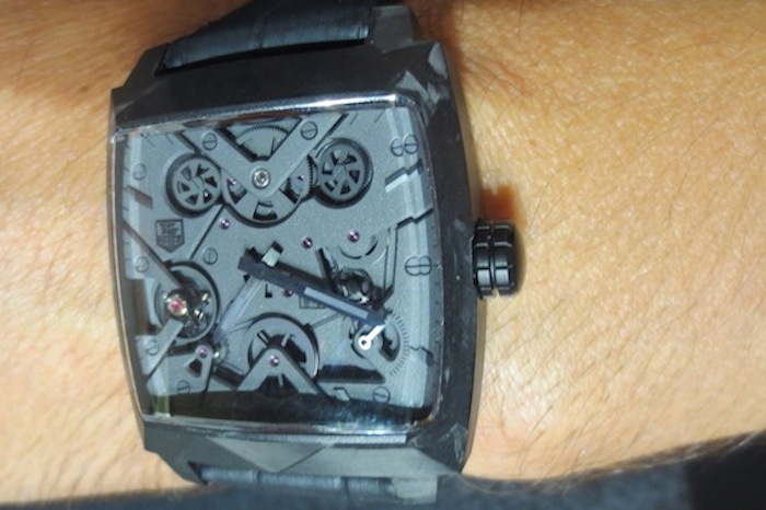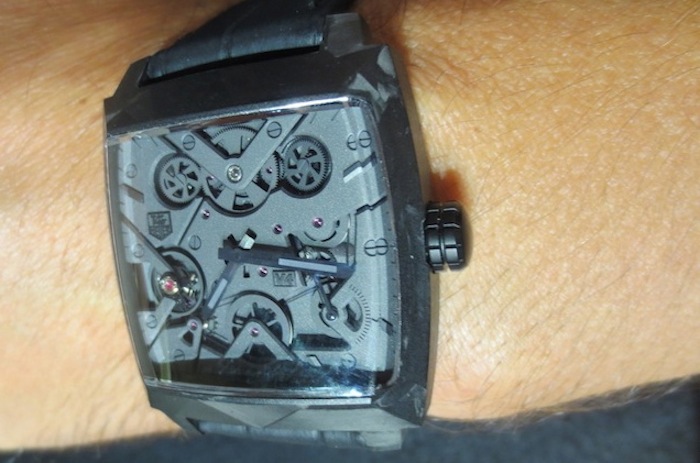 Visually the Monaco V4 Black Phantom has a really cool and contemporary industrial appearance. The term V4 refers to the V-shaped main plate (which carries the four barrels) and is inspired by the cylinders of a Formula 1 car. However this modern design still captures the spirit of the Monaco worn by the legendary Steve McQueen in the classic 1971 film Le Mans. I absolutely love the aesthetic of this 2015 version especially the carbon case and matt black/dark grey open worked dial with 7 CMC bridges. The use of this cutting edge material is new for Tag Heuer and illustrates the positive influence Jean-Claude Biver has already had on the brand. Overall the composition is refined and the finishing is absolutely first rate.