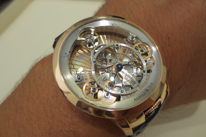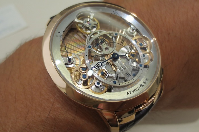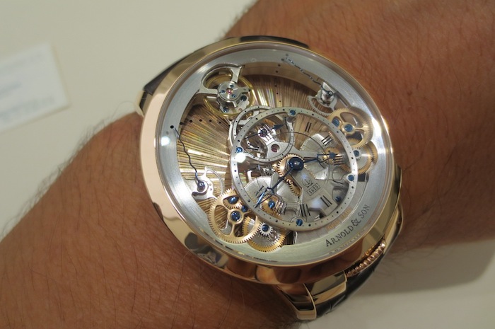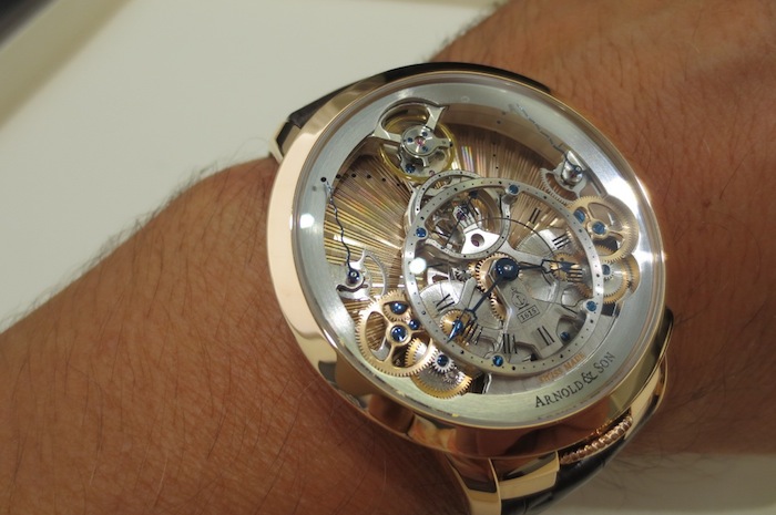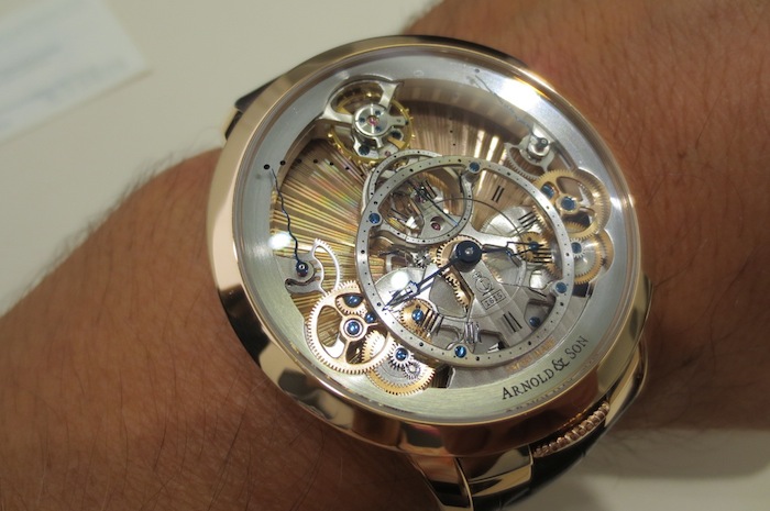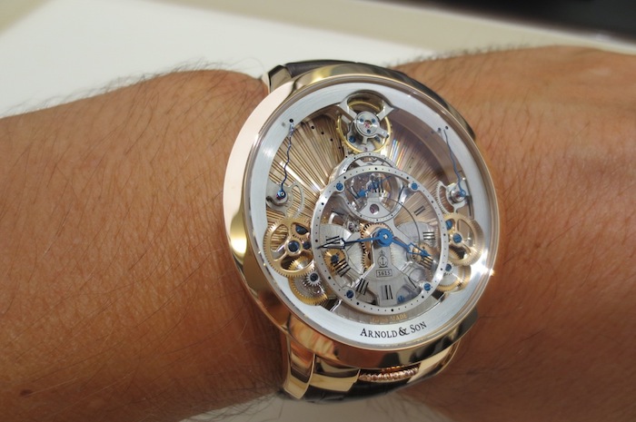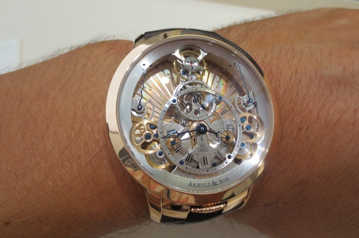 Even though I had not previously arranged a meeting with Arnold & Company, one of the personnel (from Manufacture La Joux-Perret SA) kindly let me try on the exquisite Time Pyramid Guilloché. In contrast to the formidable U10 Tourbillon Lumière the Time Pyramid Guilloché is a much more delicate affair with a diameter of only 44.6mm. These understated proportions should appeal to collectors with more traditional tastes. Generally I found the watch sat comfortably on my wrist and I would be content to wear it on a daily basis. Primarily this is down to the stylish case design and choice of luxurious 18-karat red gold used in production.