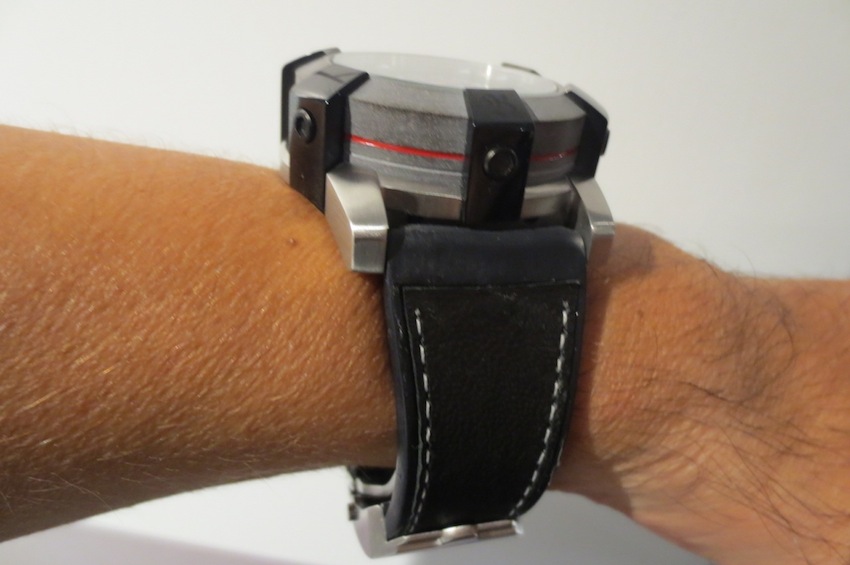 Aesthetically the Terra Australis has a strong identity and robust appearance. Part of the case is constructed from a lightweight ceramic material called Bauselite (and 316L stainless steel). At first glance it reminded me a tiny bit of polished concrete, which is now popular in aspects of product design and architecture. Christophe has developed this textured material with the assistance of Flinders University in South Australia and is being very tight lipped about how exactly it is manufactured. Other features include a top mounted crown, sleek carbon fiber dial, red hour hand and revolving central second disc. Overall the composition has a really cool feel about it and the attention to detail is first rate.