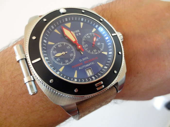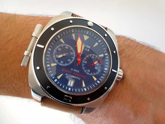 Visually the U-3001 Automatic Power Reserve has a bold and distinctive appearance. I also feel the composition is more original than previous Deutsche Master models. Don’t get me wrong I like the watches from previous collections but feel they are derivative of brands like Panerai and IWC. The U-3001 Automatic Power Reserve shows a sense of maturity, sophistication and has more expensive feel about it. I love the chunky façade with a detachable tool to replace the strap when necessary. This characteristic is quirky and enhances the overall design. Other features include a rotating bezel, blue dial with dual sub counters and domed mineral glass.