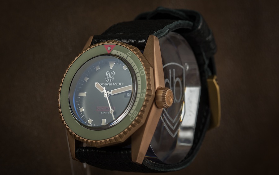 At the heart of the watch lies a self-winding movement sourced from the Swatch Group. The Calibre ETA 2824-2 comprises 25-jewels and oscillates at a frequency of 28,800 vibrations per hour (4Hz). Unfortunately on this model the mechanism isn’t visibly showcased. However the watch does have an elegant engraved VDB logo on the 316L stainless steel case back. Functionally the No Limit Bronze features hours, minutes, seconds and date facility. The timepiece also has a power reserve of 40-hours and is water resistant to a depth of 200 metres.