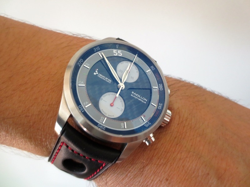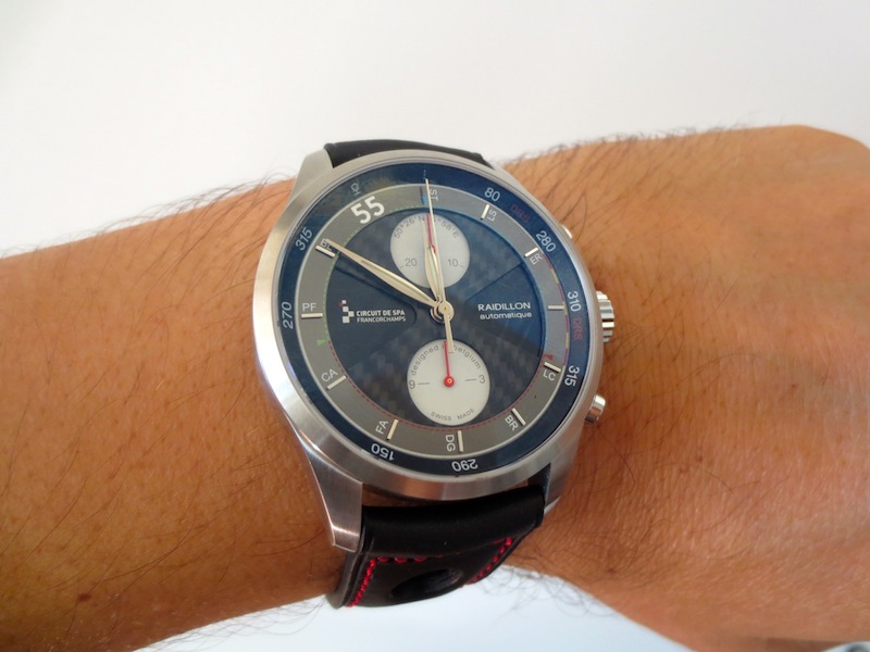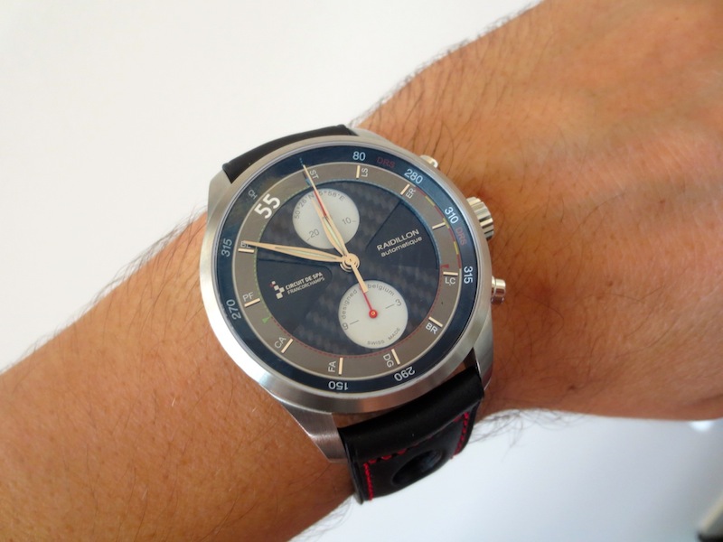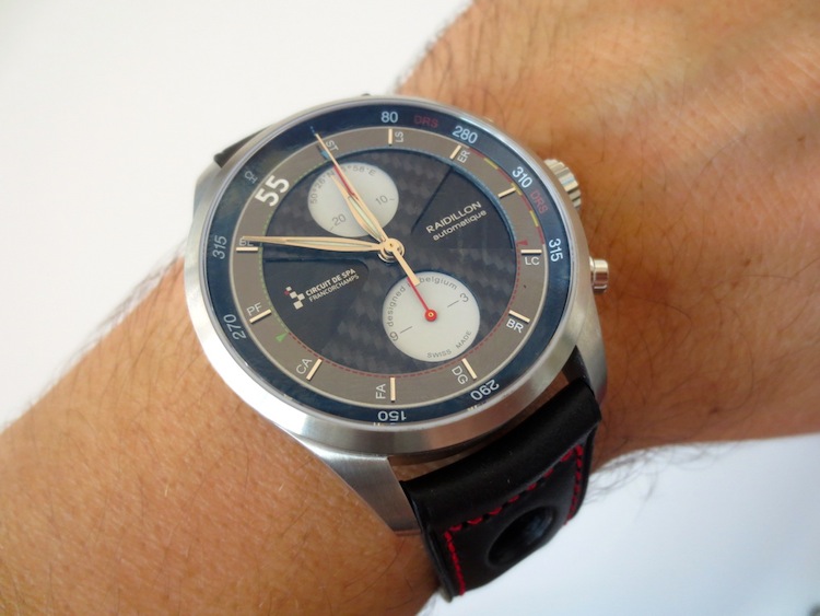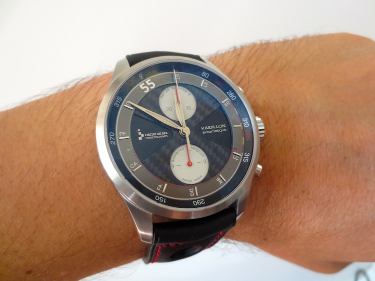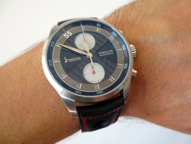 The Chronograph (as tested) is limited to only 55 pieces and has a hand sewn black buffalo leather strap with engraved (Raidillon logo) folding clasp. Priced at: €2,990 (approximately $3,341).