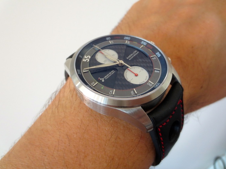 Visually the Chronograph has the same cool and sporty appearance normally found in much more expensive watches. Every aspect of the composition seems to be well considered and it is certainly designed to make a bold first impression. What makes the timepiece so appealing is the sleek black carbon fiber dial. This refined characteristic perfectly interacts with the white chronograph sub counters. Other features include the names of each of the Spa Francorchamps circuit corners (at each hour marker) and acceleration zones indication (displayed on an outer chapter ring).