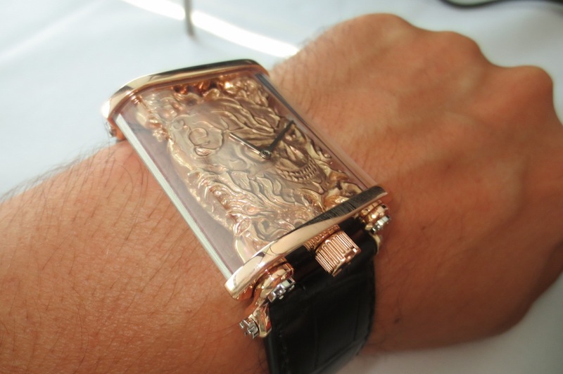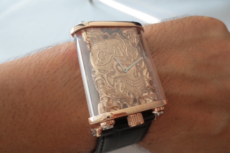 Visually the Skull has a much more traditional appearance than the more contemporary Petroleum. Certainly I would say that is a bad thing because buyers have completely different tastes. This timepiece also showcases Ollivier Savelli’s talents in the jewelry industry. What makes this watch so appealing is the finally sculptured (seemly suspended) three-dimensional engraved 18-karat gold skull dial. This exquisite characteristic works in perfect harmony with the sapphire and gold case. Other features include delicate hour/minute hands and articulated gold lugs. Overall the composition is very refined and the finishing is first rate.