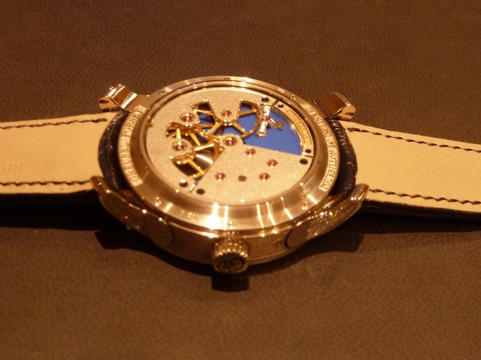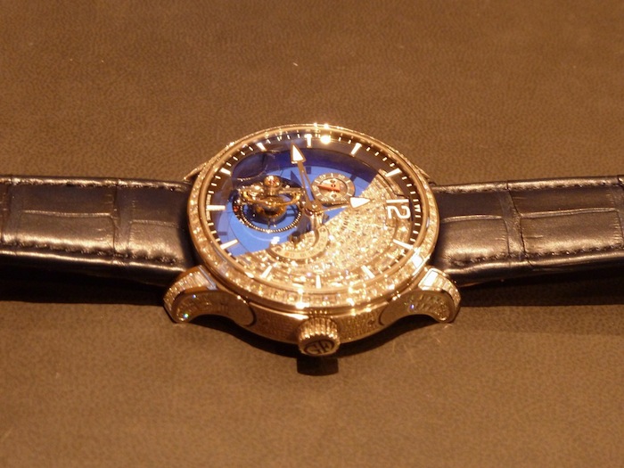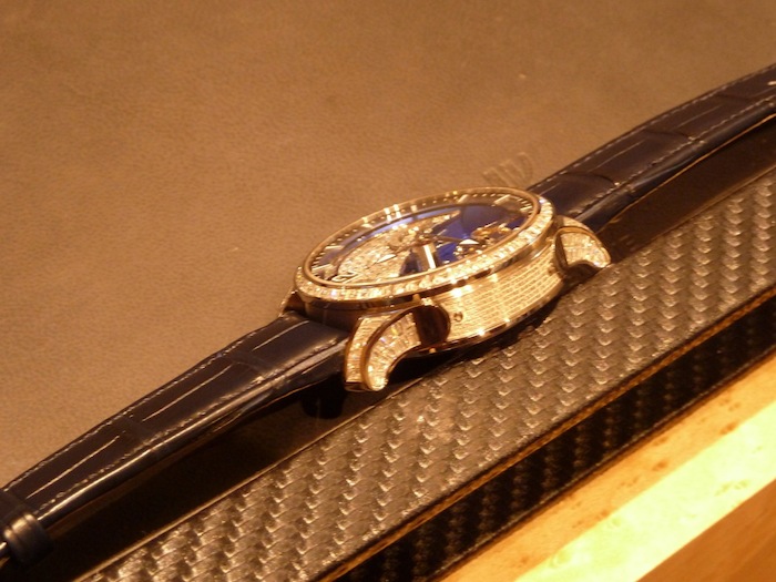 Visually the Diamond Set Tourbillon 24 Secondes Contemporain is one of the most luxurious timepieces I have ever set eyes on. What makes this watch so extraordinary is the lavish gem-set cobalt blue dial, bezel and lugs. Greubel Forsey has adorned this watch with 272 flawless baguette diamonds (clarity IF, colour D-E). Due to the rarity of these precious diamonds the company will only be able to manufacture two of these unbelievable watches a year. Other meticulous details include a retrograde power reserve, small seconds counter and exposed patented tourbillon carriage (located at 7 o’clock). Overall the composition is astounding and the attention to detail is unsurpassed.