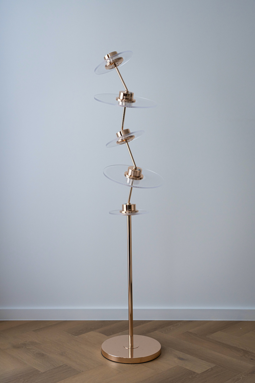 The Discovery Lamp is fabricated from polished rose gold tinted aluminium and Acrylic. It stands at 1200mm tall with a base of 300mm and weighs around 3 kg. Therefore it’s relatively mobile and can be easily relocated if desired. Personally. I feel this is a brilliant design and the build quality is suburb. The LED lights at full capacity are effective but I also love the ambient dimming facility. It’s also very easy to install with three sections and very concise instructions. Certainly, for $800AU I feel the price is very competitive.